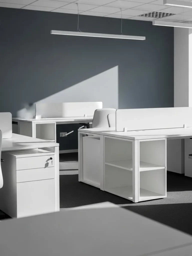 Soft Gray Office With Clean White Workstations