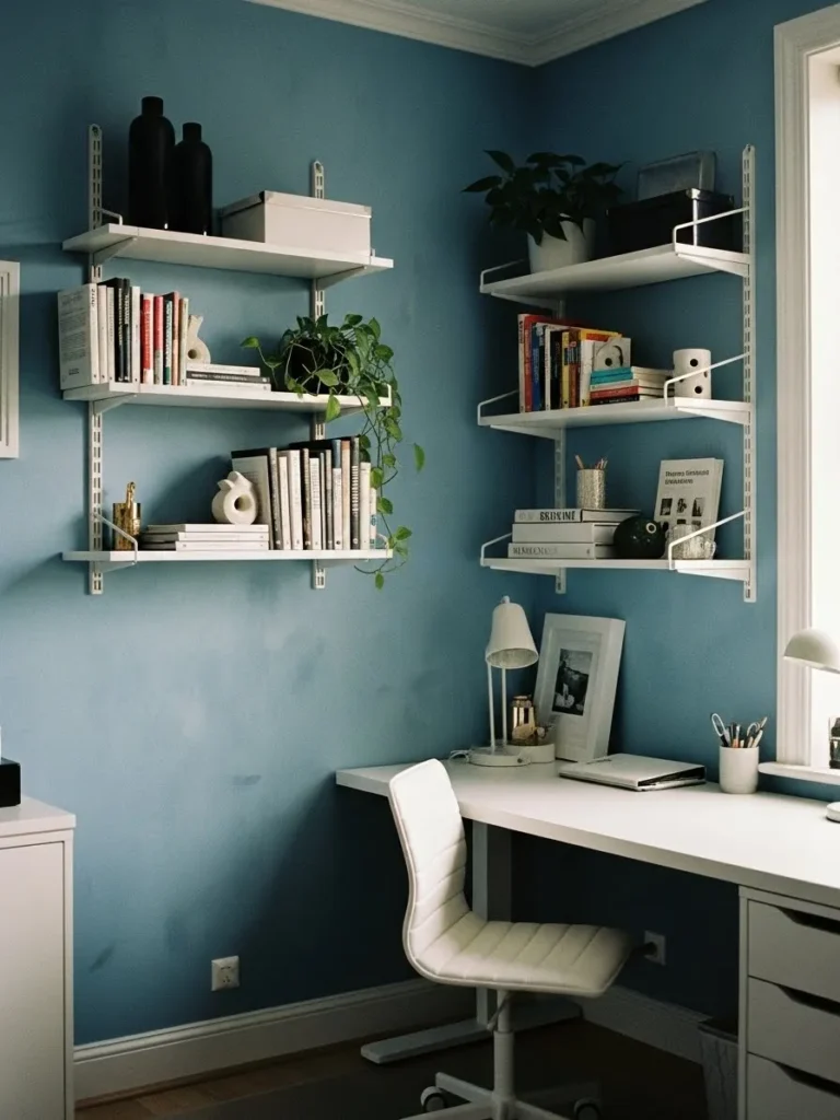 This home office features a soft muted blue wall color that instantly sets a calm and focused mood while still feeling fresh and welcoming. The crisp white desk, shelving, and chair create a clean contrast that keeps the space looking light and uncluttered. Open wall shelves styled with books, greenery, and simple decor add personality without overwhelming the room. Natural light from the window brightens everything up and makes the blue walls feel even softer, while the minimal layout keeps the workspace practical and easy to use.