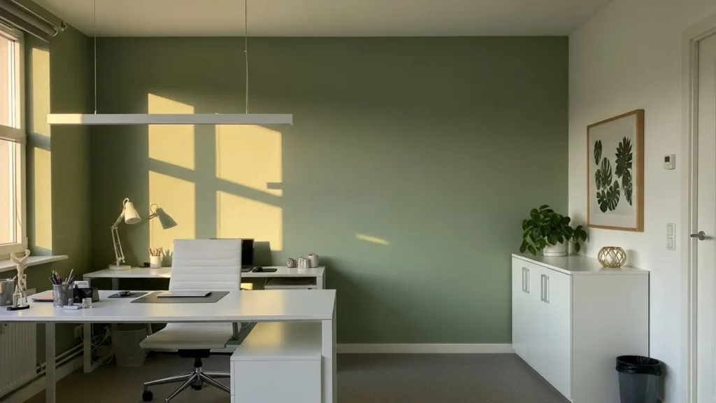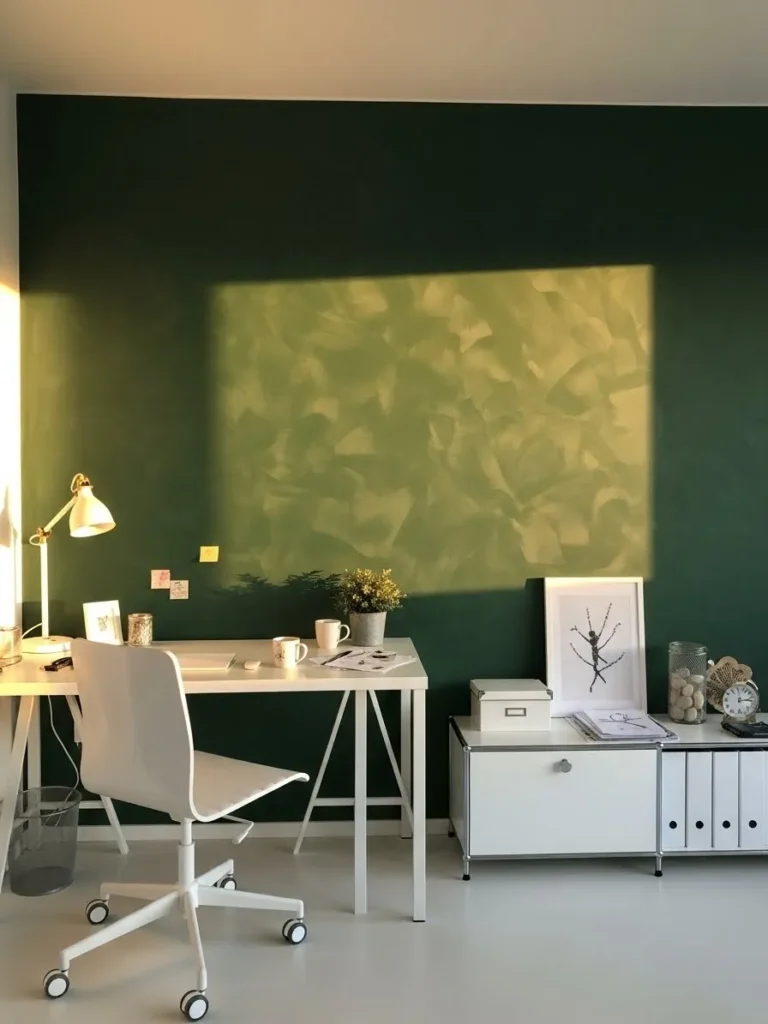 This home office features a rich deep green wall that instantly grounds the space while still feeling calm and creative. The slightly textured finish adds depth and a hand painted look that keeps the wall from feeling flat or overly formal. Crisp white furniture balances the darker paint beautifully, from the sleek desk and rolling chair to the minimalist storage units along the wall. Warm light from the desk lamp softens the contrast and makes the space feel welcoming rather than dramatic, while simple decor like framed art, neutral accessories, and small plants keeps everything feeling intentional and uncluttered.