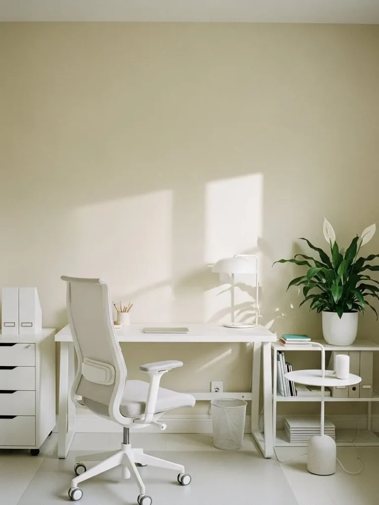 This home office keeps things light, calm, and beautifully balanced with soft sand colored walls paired with crisp white furniture. The palette feels warm without leaning yellow and neutral without feeling boring. Clean lined white desk and chair create a fresh foundation, while subtle textures like the fabric chair, smooth ceramics, and leafy greenery add just enough visual interest. Natural light bouncing off the pale walls makes the whole space feel airy and open, which is exactly what you want in a work area that needs to stay bright and focused.