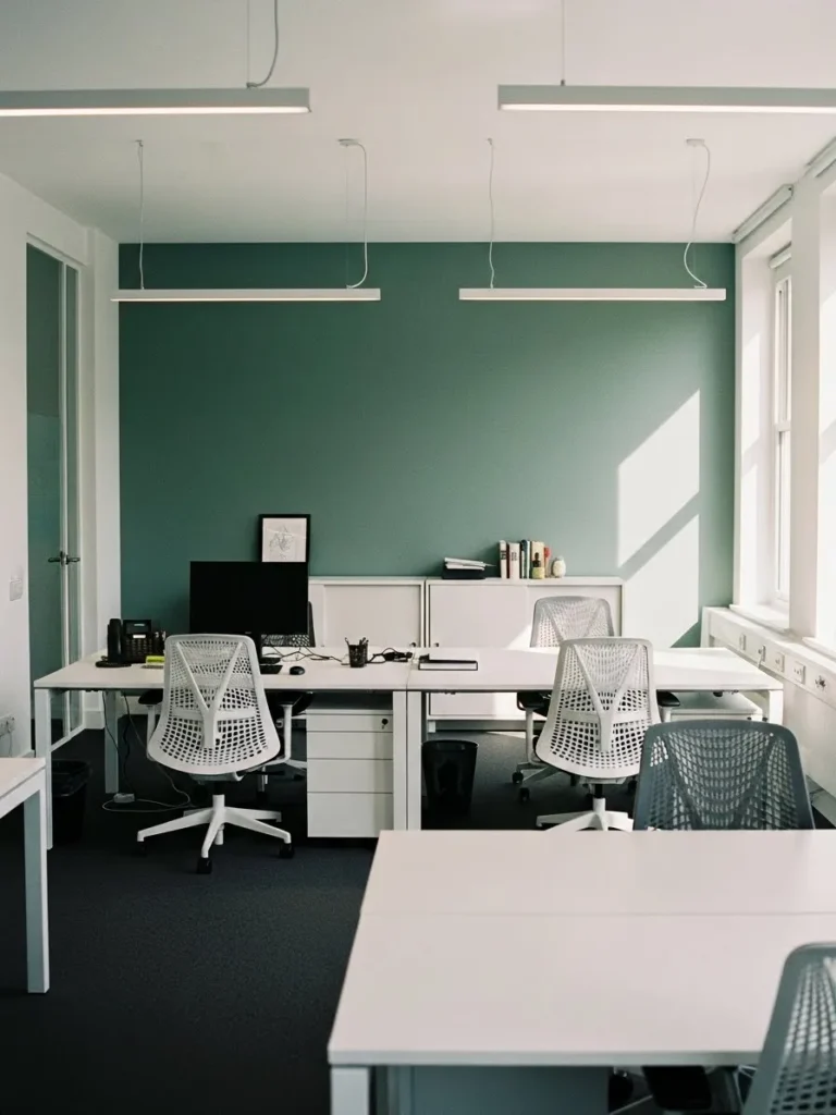 This office design pairs a muted green wall color with clean white desks and chairs for a look that feels calm but still very modern. The green leans slightly cool which keeps the space feeling fresh and focused rather than heavy. White furniture adds contrast and keeps everything looking light and uncluttered. The simple desk setup and streamlined lighting make the room feel open and practical while large windows bring in plenty of natural light that softens the overall look.