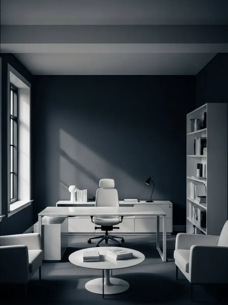 This office design feels crisp and modern thanks to the deep charcoal gray walls paired with sleek white furniture throughout the space. The color contrast is strong but still calming, especially with all that natural light bouncing off the white desks and storage units. Everything feels intentional here, from the streamlined workstations to the simple overhead lighting, which keeps the room looking uncluttered and professional. The gray walls ground the space beautifully and give the white furniture a chance to really shine without feeling stark or cold.
