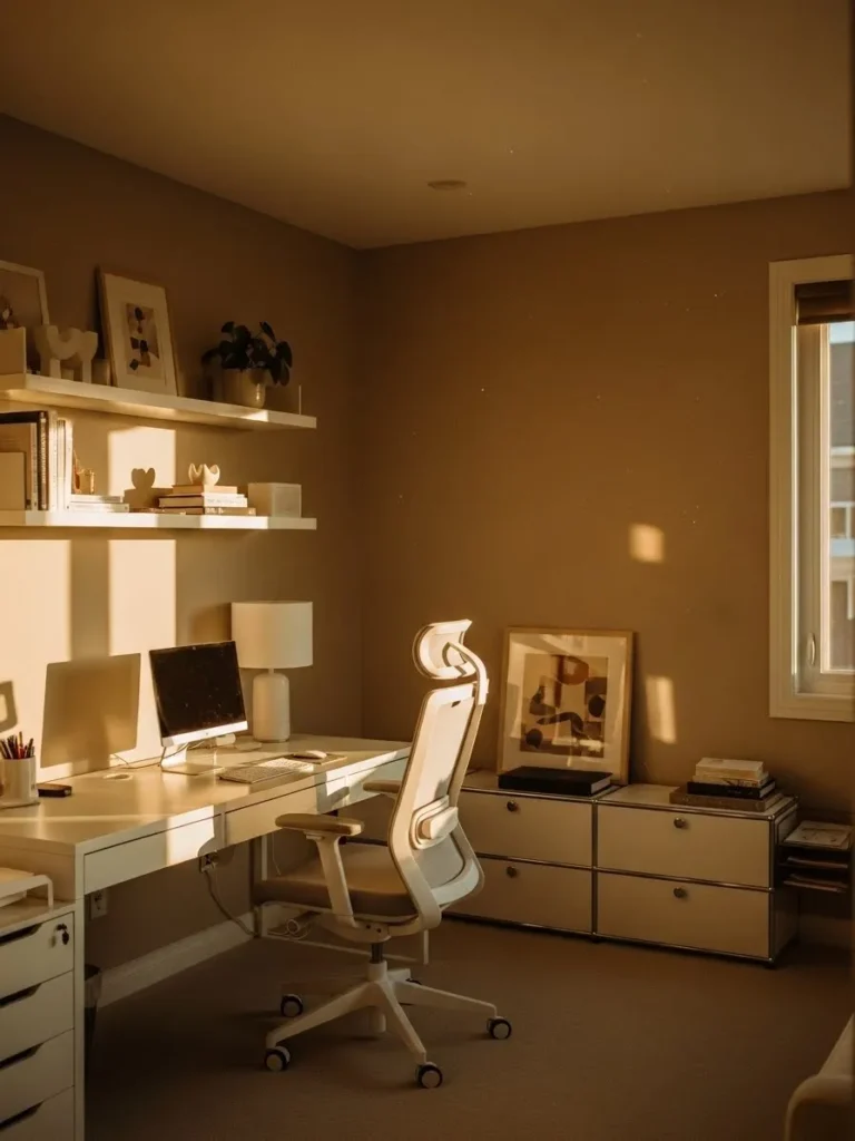 This office design wraps the room in a cozy warm tan paint color that instantly makes the space feel calm and welcoming. The white desk and ergonomic chair pop beautifully against the earthy walls, keeping everything light without feeling cold. Floating white shelves add just enough styling space for books and decor while keeping the look clean and uncluttered. Natural sunlight filters in through the window and creates those soft golden shadows that make the whole room feel lived in and relaxed. Every piece feels intentional, from the sleek white furniture to the subtle artwork leaning casually against the wall.