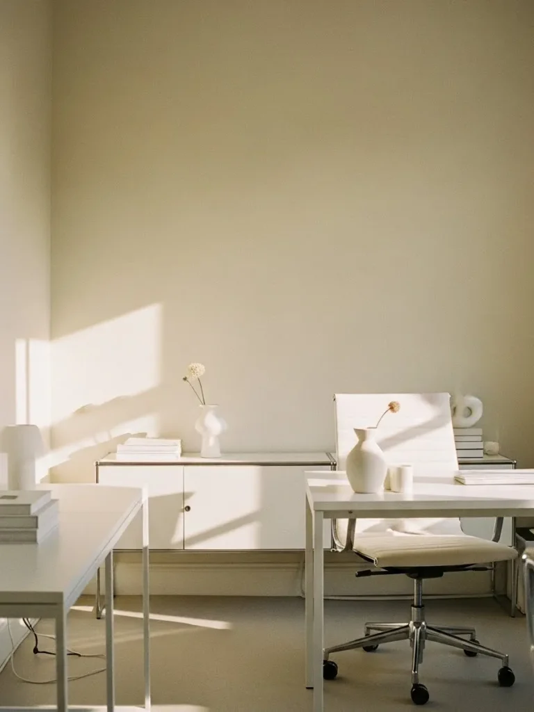 This office design leans into a soft cream wall color that feels warm, airy, and incredibly calming against crisp white furniture. The white desks and storage pieces keep everything looking light and uncluttered, while the subtle beige undertones in the walls add just enough depth so the space never feels flat. Natural light pours in and bounces beautifully off the pale surfaces, making the room feel bigger, brighter, and effortlessly put together. Simple decor like ceramic vases and stacked books adds texture without visual noise, which is perfect for a workspace that wants to feel serene and focused.