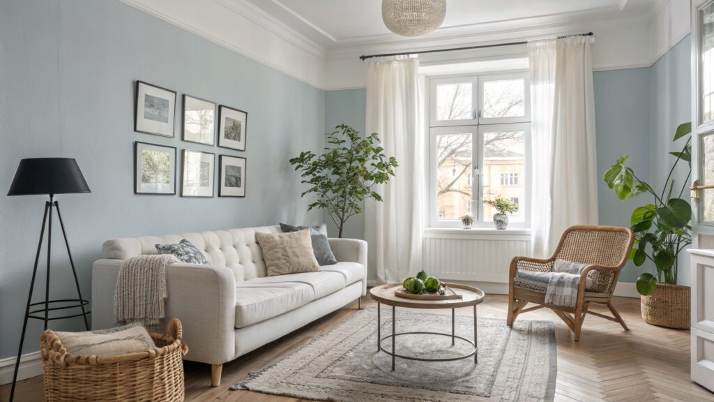This living room goes with a pale blue-gray paint on the walls. It seems closest to Benjamin Moore Palladian Blue or Sherwin Williams Sea Salt, maybe Behr’s Silver Drop too. It’s one of those cool neutrals that adds just a touch of color. Folks like it because it keeps things calm and open, especially around wood floors and cream furniture.
