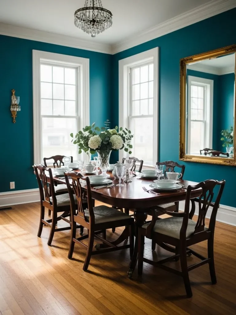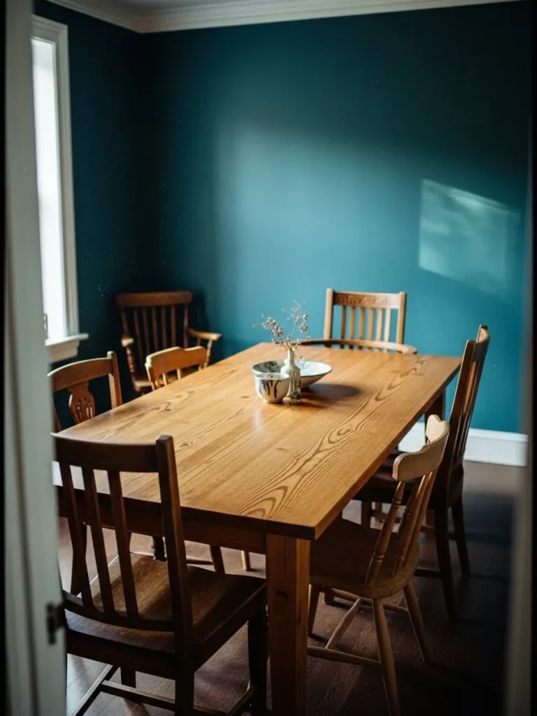 This dining room uses teal walls to turn a smaller space into something cozy and intentional. The compact wooden table and chairs fit perfectly, making the room feel snug without feeling cramped. The deeper teal tone adds depth and helps the space feel enclosed in a warm and inviting way.