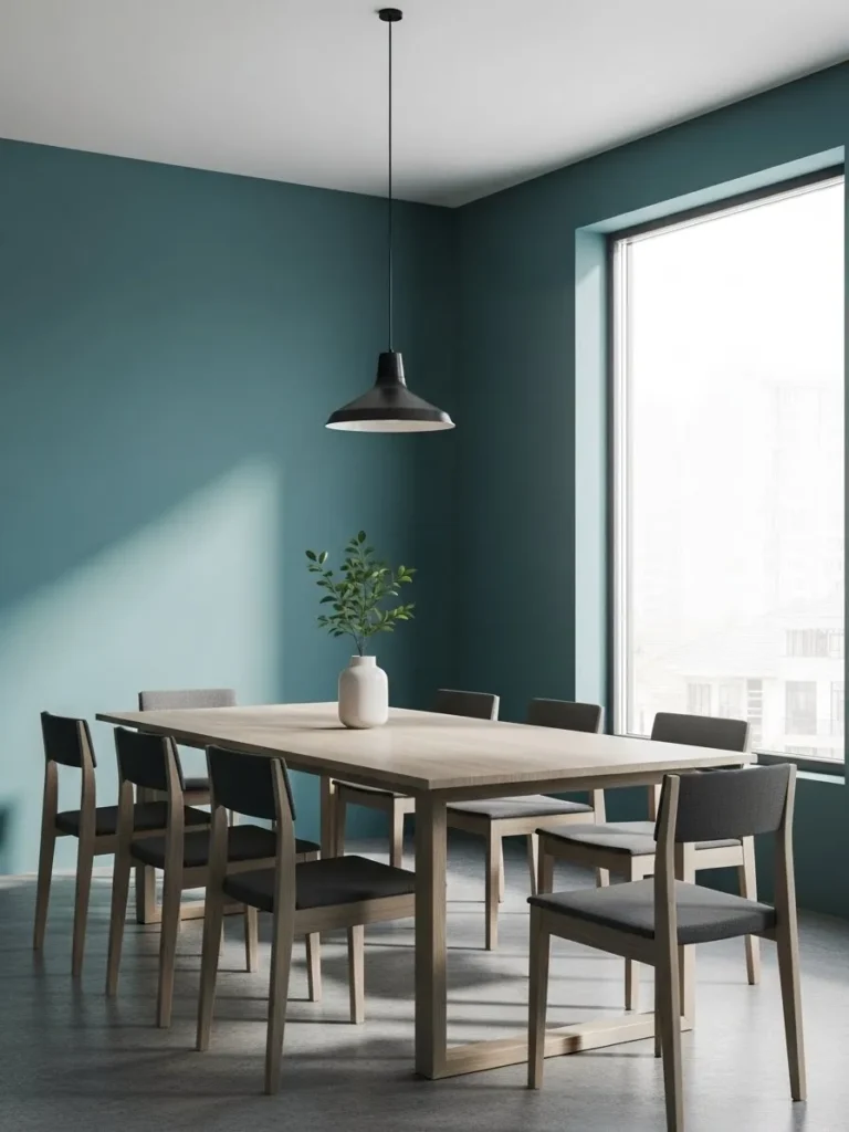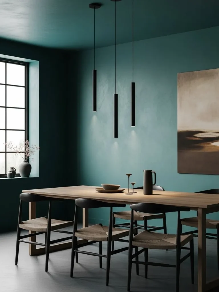 This dining room blends cool teal walls with light wood furniture and minimal decor. Slim pendant lights and simple chairs keep the look airy and modern. The overall design feels balanced and uncluttered, with the teal acting as a calm backdrop rather than a bold statement.