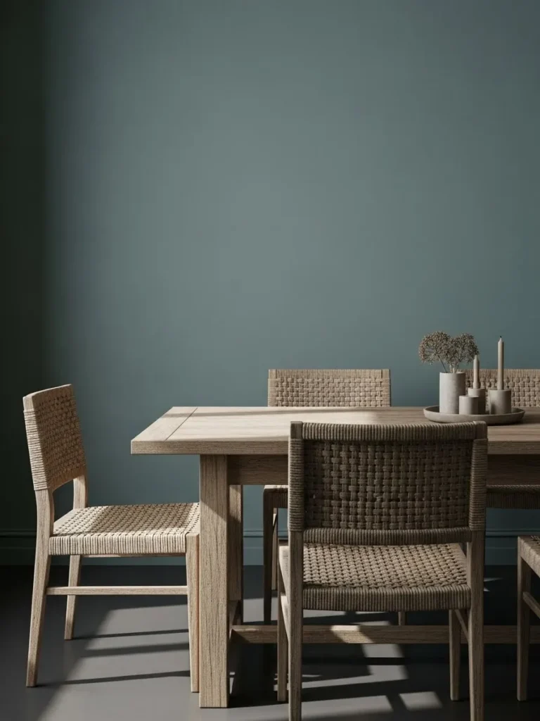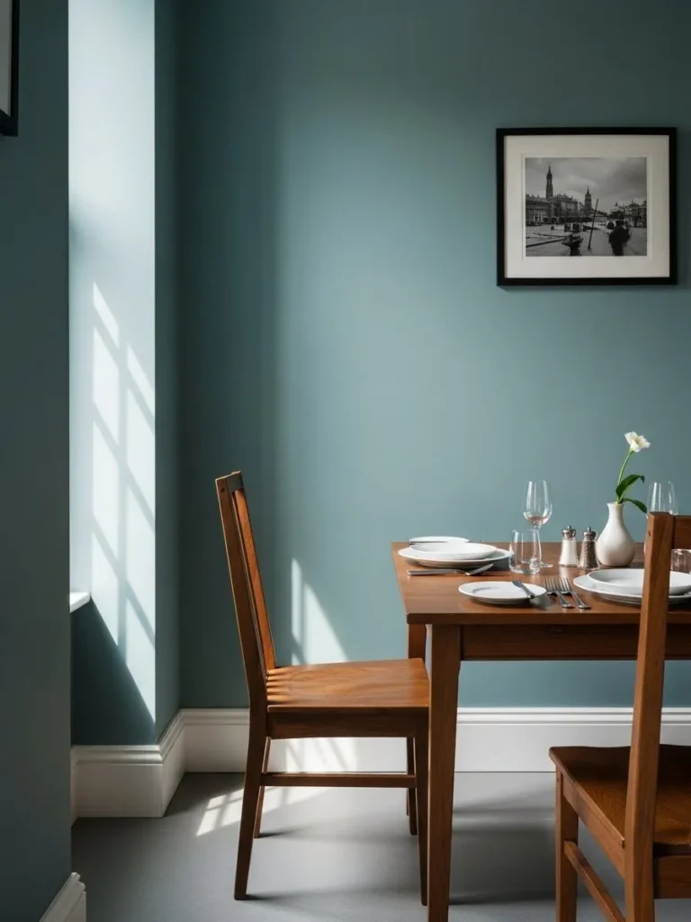 This dining room features smooth teal walls, simple wooden chairs, and a clean layout that emphasizes space and light. The color feels calm and modern, giving the room structure without visual clutter. Natural light casts gentle shadows that make the teal feel even softer.