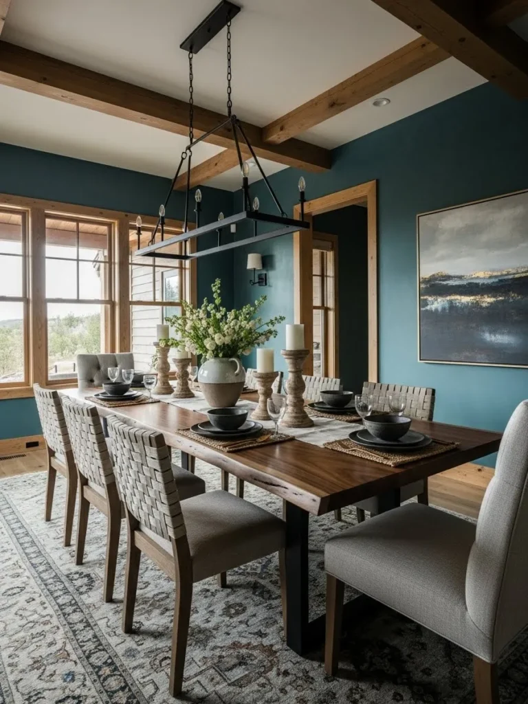Refined Teal Dining Room With Rustic Elegance