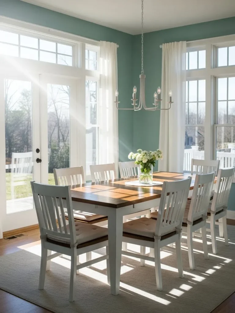 This dining room feels light and open with soft teal walls, white furniture, and large windows that let sunlight flood the space. The color feels fresh and breezy, giving the room a relaxed and cheerful energy. Everything looks balanced and easy, with a focus on comfort and light.