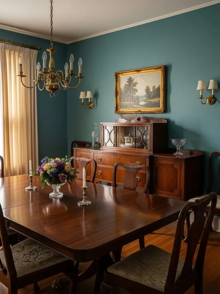 This dining room blends teal walls with antique style furniture, layered textiles, and classic decor. The darker teal creates a moody backdrop that makes the wood tones and decorative pieces stand out. A chandelier adds softness and elegance without overpowering the room.