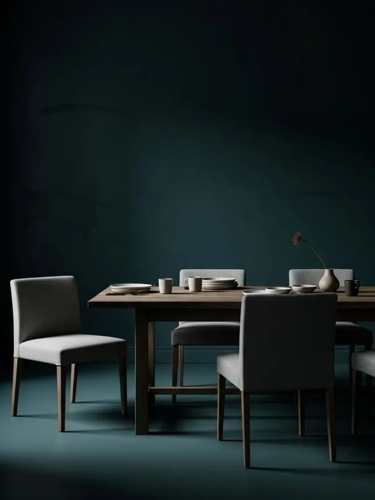 This dining room leans into deep teal walls and low lighting to create a dramatic and intimate mood. The furniture is simple and modern, letting the color do most of the talking. Dark tones, soft shadows, and clean silhouettes give the room a quiet sophistication that feels very intentional.
