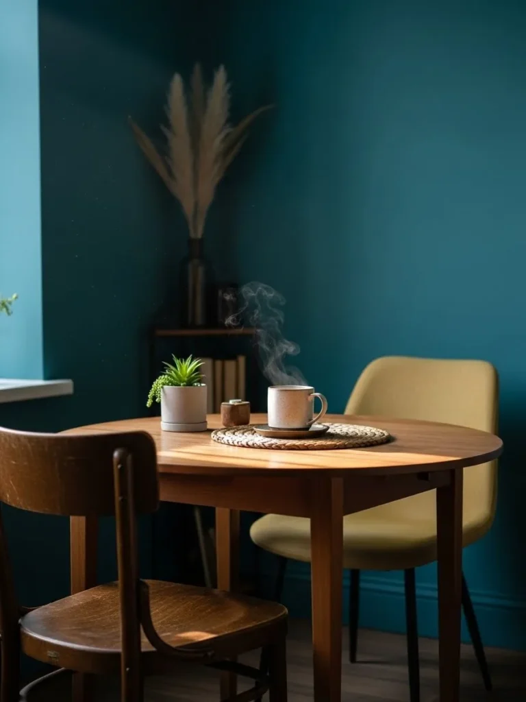 This small dining area uses rich teal walls to create a cozy and intimate setting. A round wooden table and mixed seating add character and comfort, while simple decor keeps the space feeling relaxed and personal. The teal wraps the room in a way that makes it feel inviting rather than enclosed.