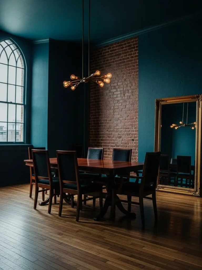 This dining room combines deep teal walls with exposed brick, dark wood floors, and dramatic lighting. The contrast between textures adds depth and gives the room a strong visual presence. Tall windows and reflective surfaces help balance the darker tones and keep the space from feeling heavy.