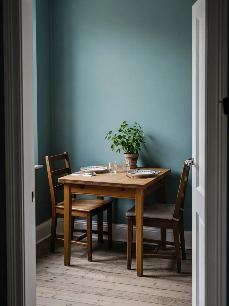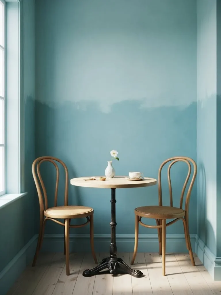 This small dining area uses soft teal walls to create a light and relaxed atmosphere. The simple round table and classic chairs keep the space casual and functional. Natural light reflects gently off the walls, making the nook feel open despite its size.