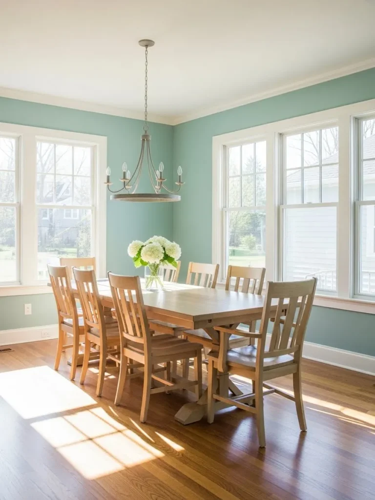 This dining room feels fresh and welcoming with soft teal walls, warm wood floors, and plenty of natural light pouring in through large windows. The wooden dining set keeps things classic and familiar, while the gentle teal adds a layer of calm that makes the space feel relaxed and easy to live in. Everything feels balanced and comfortable without looking too styled or stiff.