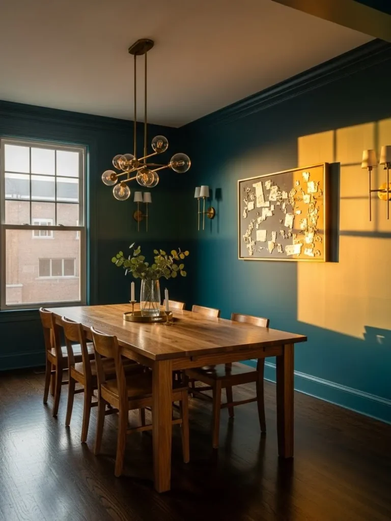 This dining room features deep teal walls paired with warm wood furniture and soft lighting. Sunlight hits the walls at just the right angle, creating a golden glow that contrasts beautifully with the cooler paint color. Statement lighting and simple decor keep the room grounded and stylish.