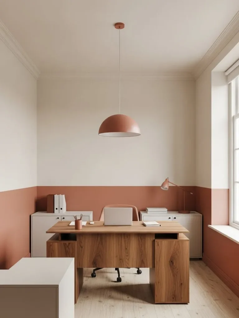 This home office plays with a soft two tone look that feels both modern and warm. The creamy upper walls keep the space light and airy while the muted terracotta lower half adds just enough color to make the room feel grounded and cozy. The clean lines of the wooden desk bring in natural texture and warmth without overpowering the space. Simple storage pieces and matching lighting keep everything feeling calm and uncluttered. The whole setup feels balanced and intentional which is exactly what you want in a workspace that still feels like part of your home.
