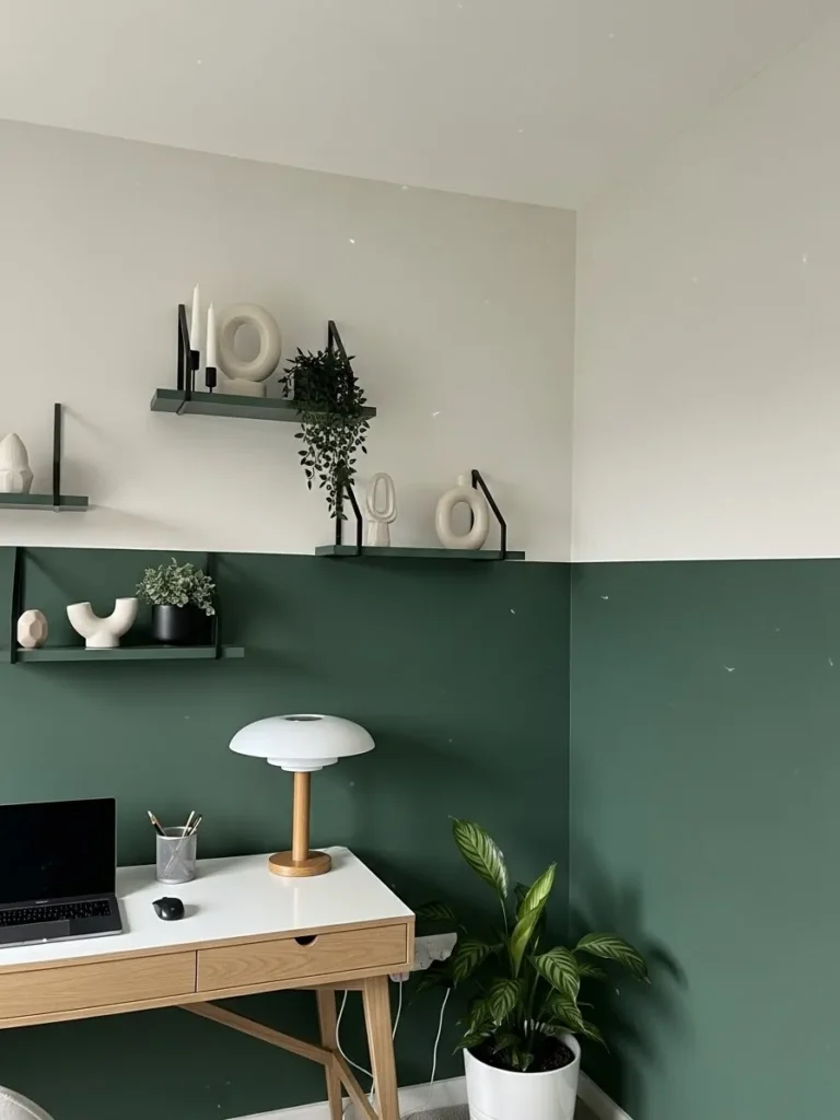 This two tone home office pairs a deep earthy green on the lower half of the walls with a soft warm white above, creating a look that feels grounded but still light and airy. The color split sits just below eye level, which visually anchors the space and makes the room feel more intentional and styled. Open floating shelves add personality without clutter, styled with minimal ceramics and trailing greenery for that calm modern vibe. The light wood desk warms everything up beautifully, while the simple white lamp and clean lines keep the space feeling fresh and uncluttered.
