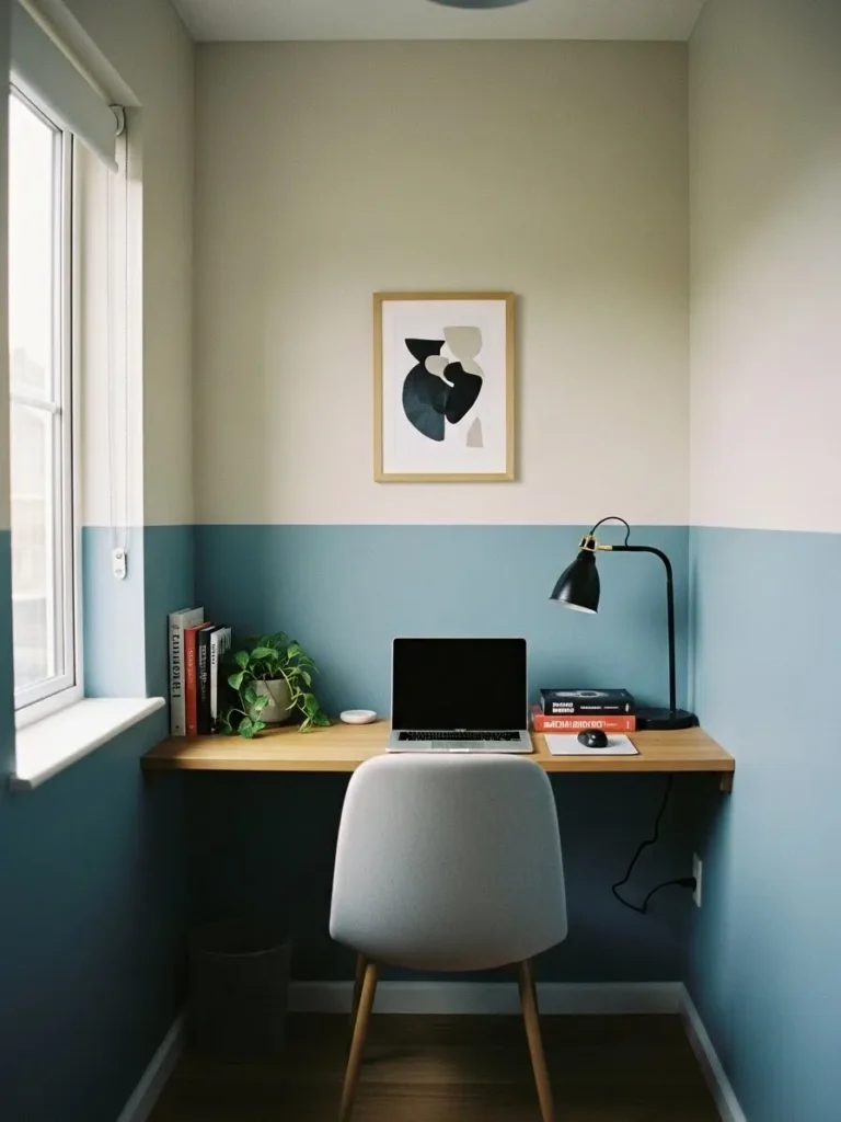 This small home office makes the most of a narrow space by using a calming two tone paint look that feels both modern and cozy. The lower half of the walls is painted in a muted blue green shade that grounds the room, while the upper portion stays light and airy in a warm neutral. A simple wood desk floats neatly between the walls, paired with a soft upholstered chair that keeps the setup from feeling too rigid. Natural light from the window brightens the space, and minimal decor like a small plant, framed art, and a sleek black desk lamp keeps everything clean and intentional without feeling cold.