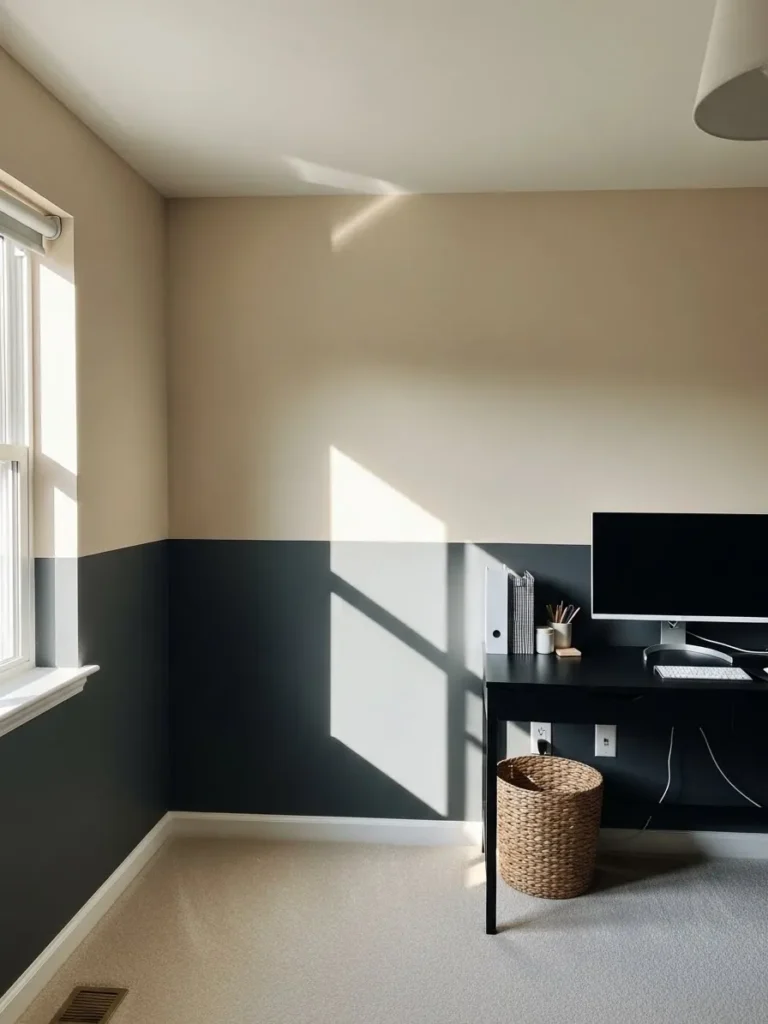 This home office plays with a clean two tone split that feels modern without trying too hard. The upper walls are painted in a warm soft beige that keeps the room light and open, while the lower half brings in a deep charcoal tone that adds contrast and grounding. The horizontal color break gives the walls structure and makes the space feel intentionally designed. Simple black furniture, a minimal desk setup, and natural light from the window keep everything feeling calm, functional, and uncluttered.