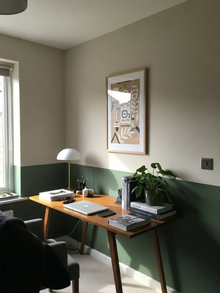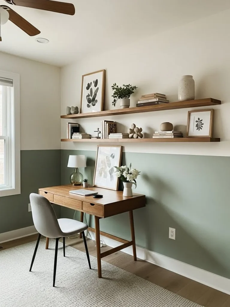 This home office uses a gentle two tone paint treatment with a soft sage green on the lower half of the walls and a warm creamy white above. The horizontal color break feels calm and balanced and it instantly adds structure without making the room feel busy. Natural light pours in from the window which makes the green look fresh and airy instead of heavy. The warm wood desk and mid century inspired storage bring in just enough contrast while the simple artwork and minimal styling keep everything feeling uncluttered and focused.