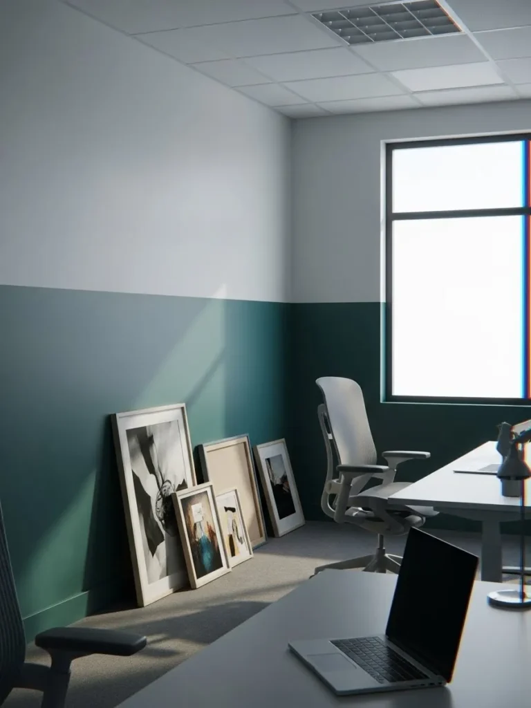 This office design plays with a soothing two tone combo that feels fresh without trying too hard. The lower half of the walls is painted in a muted teal green that adds depth and calm, while the upper white keeps everything light and airy. Natural light pours in from the large window, making the contrast feel soft rather than harsh. The minimalist furniture, simple desk setup, and neutral flooring let the paint colors do the talking, while the framed artwork casually leaning against the wall adds that effortless lived in vibe that Pinterest loves.