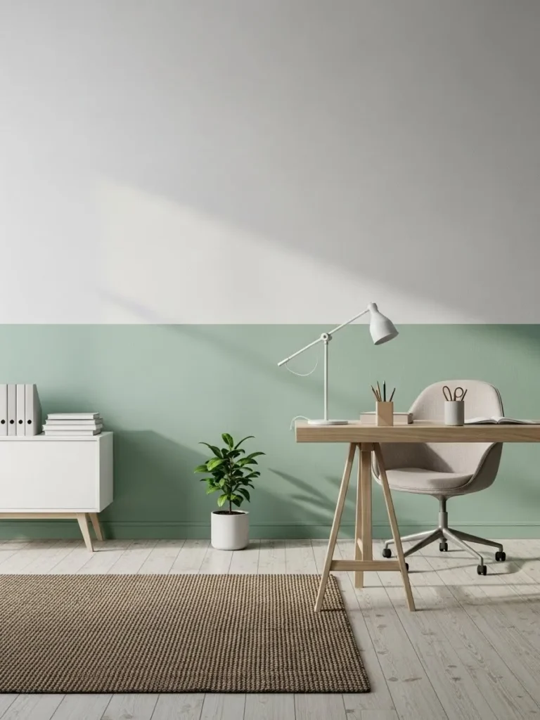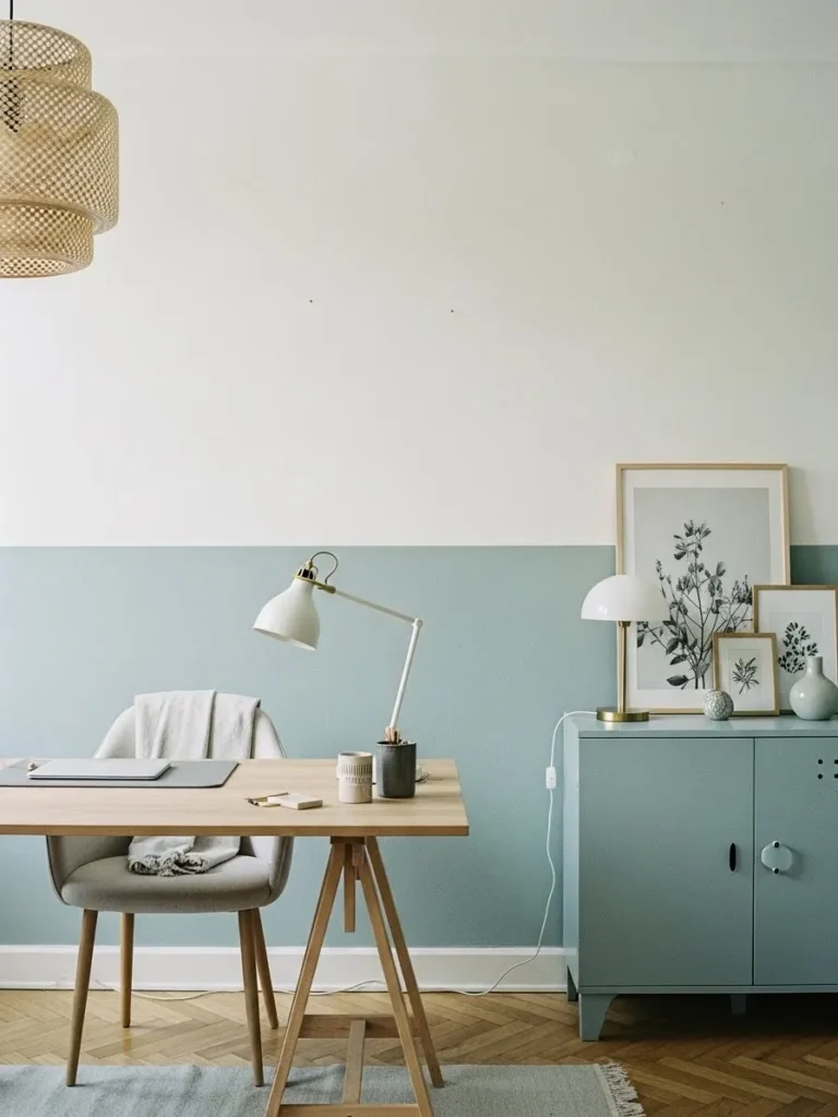 This home office shows off a beautifully balanced two tone paint look with crisp white on the upper walls and a soft sage blue green shade wrapping the lower half. The contrast feels clean but still gentle, which is perfect for a space meant for focus and creativity. Light wood furniture adds warmth and keeps the room from feeling too cool, while the simple desk, cozy chair, and minimal decor give everything a relaxed Scandinavian vibe. The subtle color break creates visual interest without shouting for attention, and the whole setup feels airy, calm, and thoughtfully put together.