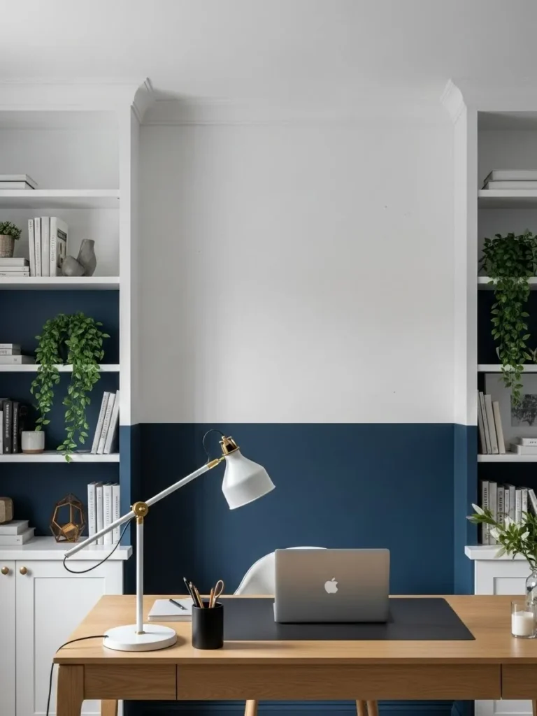 This home office nails that clean two tone look with a soft white upper wall and a deep navy blue lower section that grounds the whole space. The contrast feels fresh but not harsh, especially paired with the warm wood desk and those lovely built in shelves on either side. I love how the shelving is styled with simple books, trailing greenery, and a few minimal decor pieces because it keeps everything feeling calm and intentional. The white desk lamp and chair brighten things up even more, while the darker wall color adds just enough depth to make the space feel designed rather than plain.