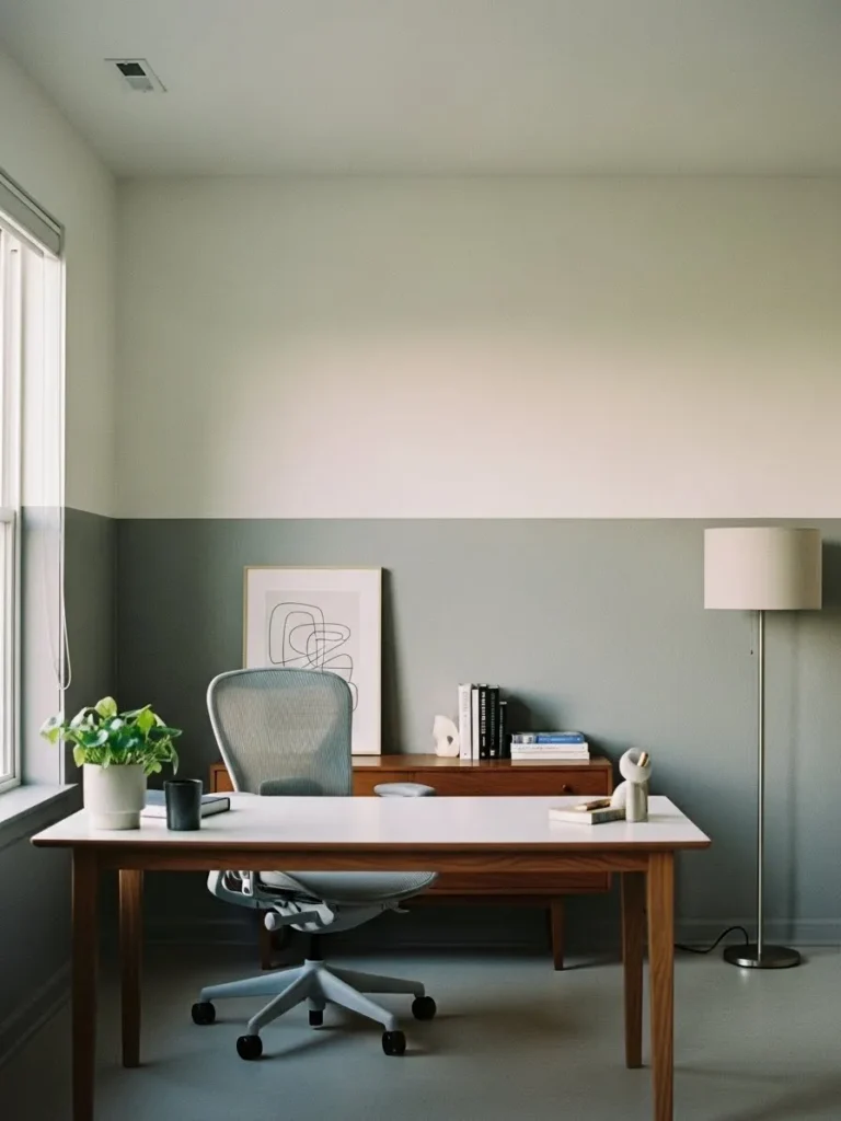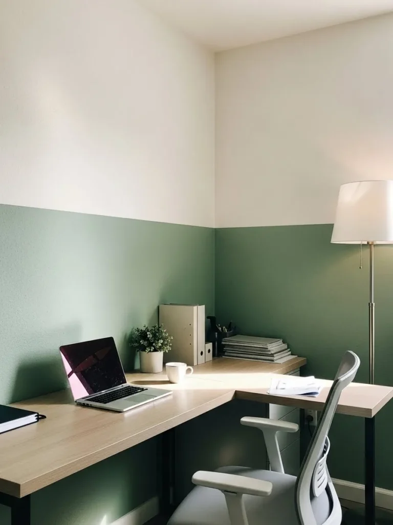 This office design keeps things calm and modern with a simple two tone paint idea that feels very easy to live with. The lower half of the walls is painted in a soft sage green that adds just enough color, while the upper half stays a warm creamy white to keep the space light and open. Clean lines, a pale wood desk, and a streamlined chair give the room a tidy and uncluttered look. The floor lamp and small plant add warmth without taking over, which makes the whole setup feel balanced and quietly stylish.