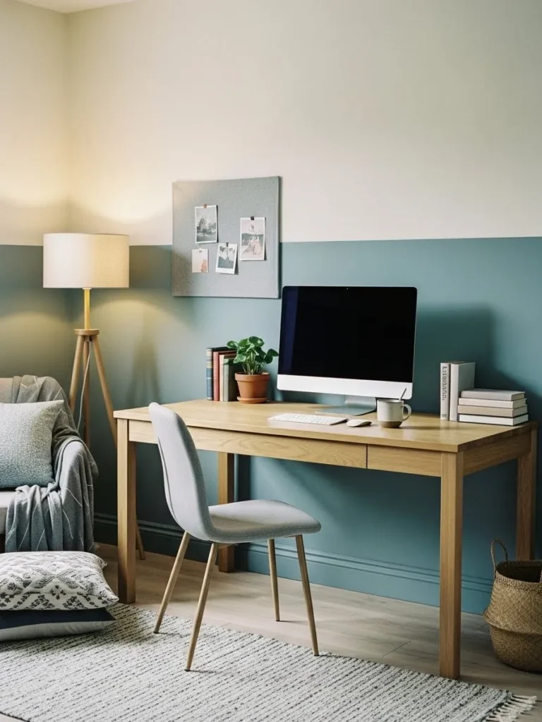 This home office uses a calm two tone paint look with a soft blue green shade on the lower wall and a warm off white on top which instantly makes the space feel taller and brighter. The clean horizontal line feels modern but still cozy and it pairs beautifully with the light wood desk and neutral chair. Simple styling keeps the room airy with a small plant for life warm lighting from the floor lamp and just enough decor to feel personal without clutter. It feels balanced peaceful and very easy to live with.