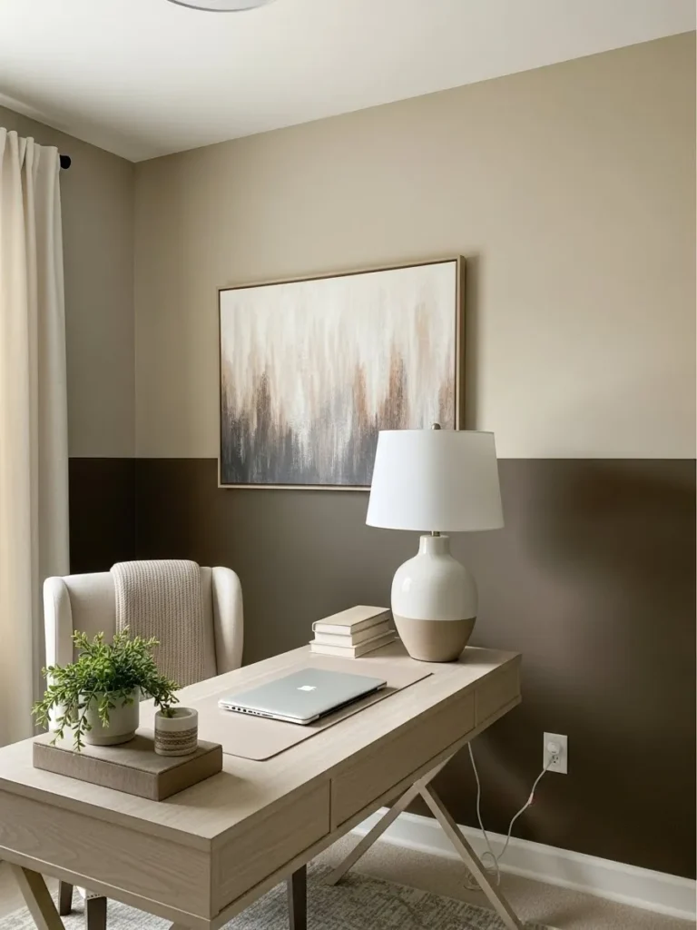 This home office uses a beautifully balanced two tone paint look with a soft taupe on the upper walls and a deeper mocha brown grounding the lower half. The color transition feels clean and intentional, giving the room structure without making it feel boxed in. Light wood furniture keeps things airy, while creamy white accents like the lamp, chair, and curtains soften the darker tones. Everything feels calm and cohesive, from the simple artwork to the subtle greenery that adds just enough life without stealing attention.