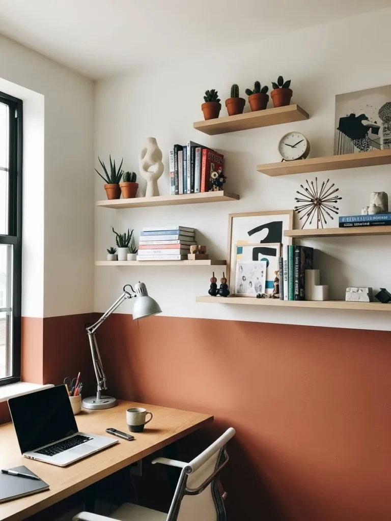 This home office plays with a cozy two tone palette that feels both modern and grounded. The lower half of the wall is painted in a warm terracotta shade that adds depth and personality, while the upper half stays soft and creamy to keep the room light and open. Natural wood shelves float effortlessly along the wall, styled with books, plants, and simple decor that feels collected rather than cluttered. The desk setup is clean and minimal, letting the paint colors do most of the talking, and the natural light from the window ties everything together beautifully.