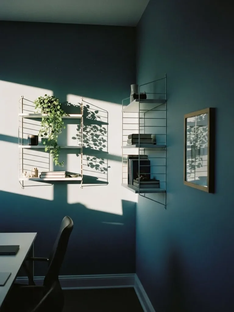 This office space features a rich moody blue wall color that instantly adds depth without feeling heavy. The matte finish keeps it soft and calming while the clean white shelving pops beautifully against the darker backdrop. Simple wire shelves float on the wall with just enough styling to feel intentional. Think stacked books, a trailing plant, and a few understated decor pieces. Natural light washes across the walls and creates gentle shadows that make the color feel layered and alive. The overall look feels modern, minimal, and quietly confident.