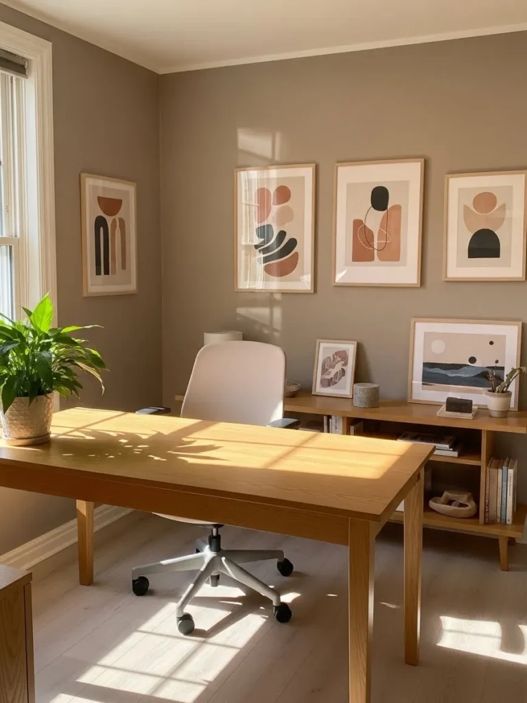 This home office features a soft greige wall color that feels calm, balanced, and quietly stylish without trying too hard. The shade sits perfectly between beige and gray, giving the room a warm neutral base that works beautifully with natural light. Light wood furniture adds warmth and keeps the space from feeling flat, while the simple desk design and clean lines make it feel modern and practical. The framed abstract art brings in gentle earthy tones that tie everything together without overpowering the room. A touch of greenery by the window adds life and makes the space feel fresh and welcoming.