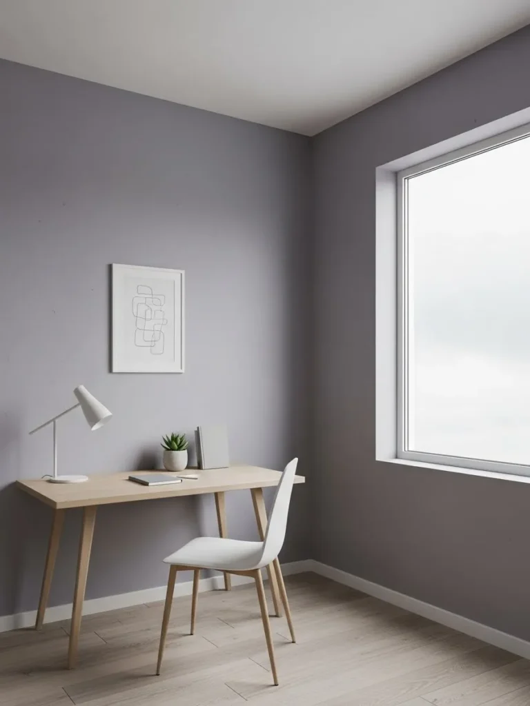 This office design keeps things calm and uncluttered with soft lavender gray walls that feel airy but still grounded. The color reads as a gentle gray with a whisper of purple, which gives the space a subtle personality without shouting for attention. Light wood flooring and a simple pale wood desk warm things up, while the white chair and desk lamp keep the look crisp and modern. Natural light pours in through the window, making the paint color shift slightly throughout the day, which adds just enough visual interest to an otherwise minimal setup.