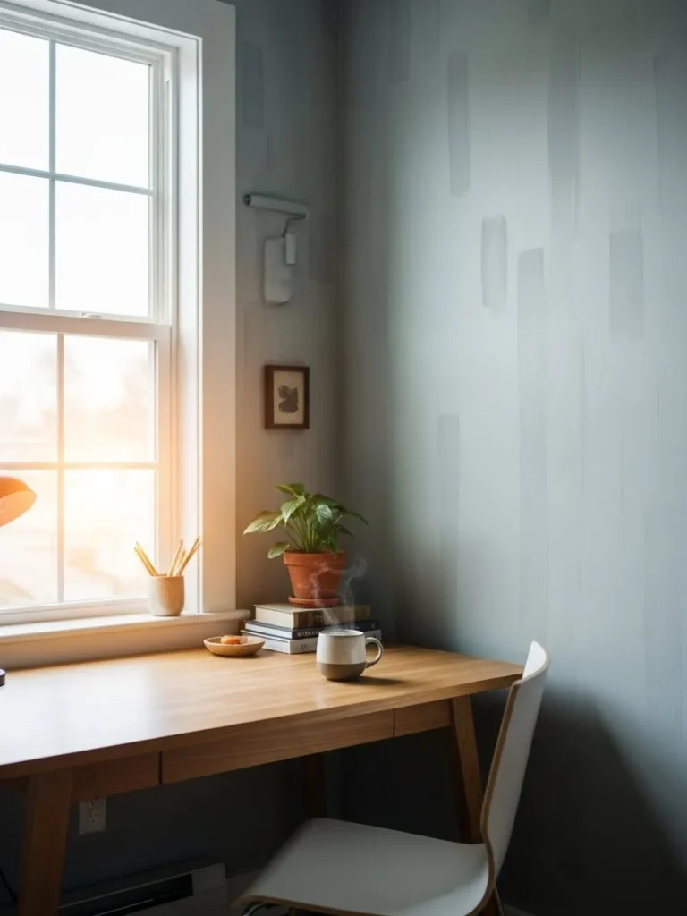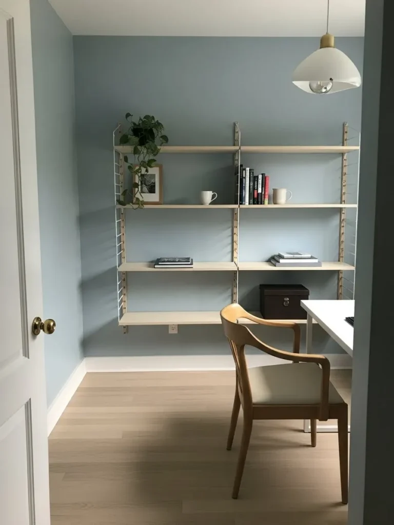 This cozy little office setup feels calm and thoughtfully put together, thanks to the soft blue gray walls that quietly set the mood without stealing the spotlight. Natural light pours in through the window and bounces gently off the muted paint color, making the space feel airy but still grounded. The warm wood desk adds just enough contrast to keep things interesting, while simple decor like stacked books, a leafy plant, and a ceramic mug make the whole nook feel lived in and inviting. It is minimal without feeling bare, and relaxed without looking unfinished.