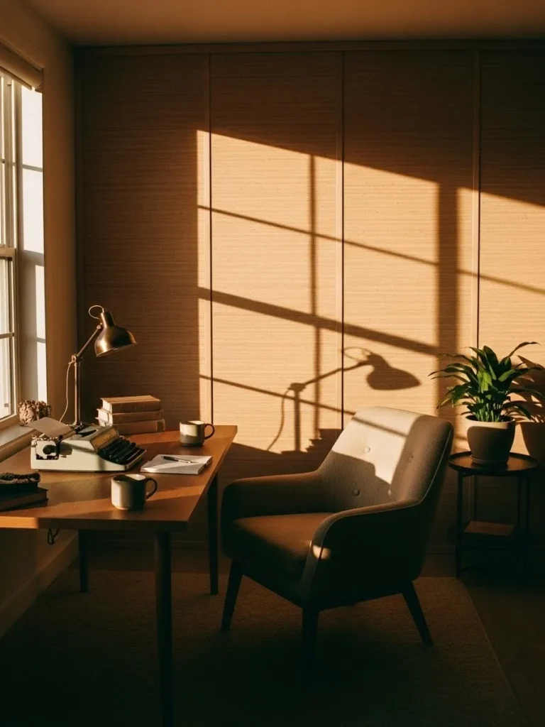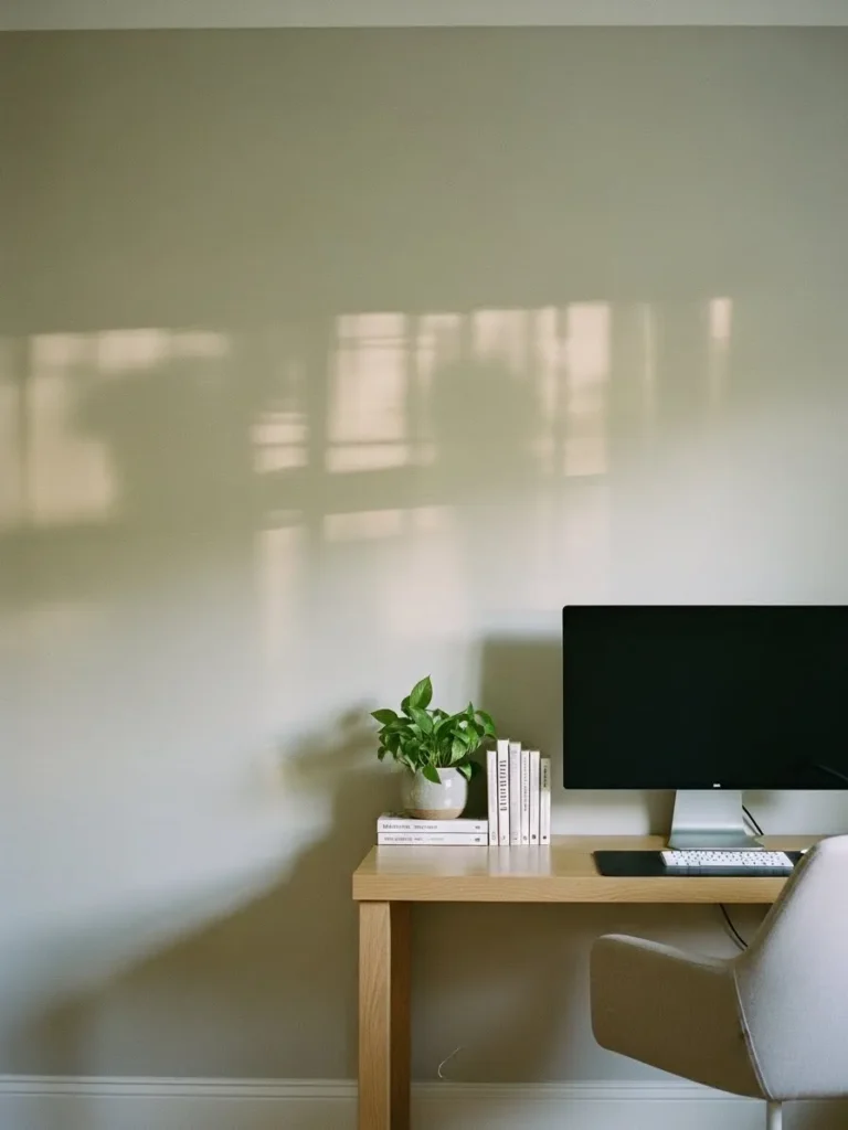 This office feels warm and calm thanks to a soft honey toned wall color that almost looks like woven fabric when the light hits it. The paint wraps the room in a gentle warmth that pairs beautifully with the simple wooden desk and cozy upholstered chair. Sunlight streaming through the window creates dramatic shadows that make the walls feel alive without being loud. Everything in the space feels intentional but not staged, from the vintage style desk lamp to the leafy plant tucked into the corner.