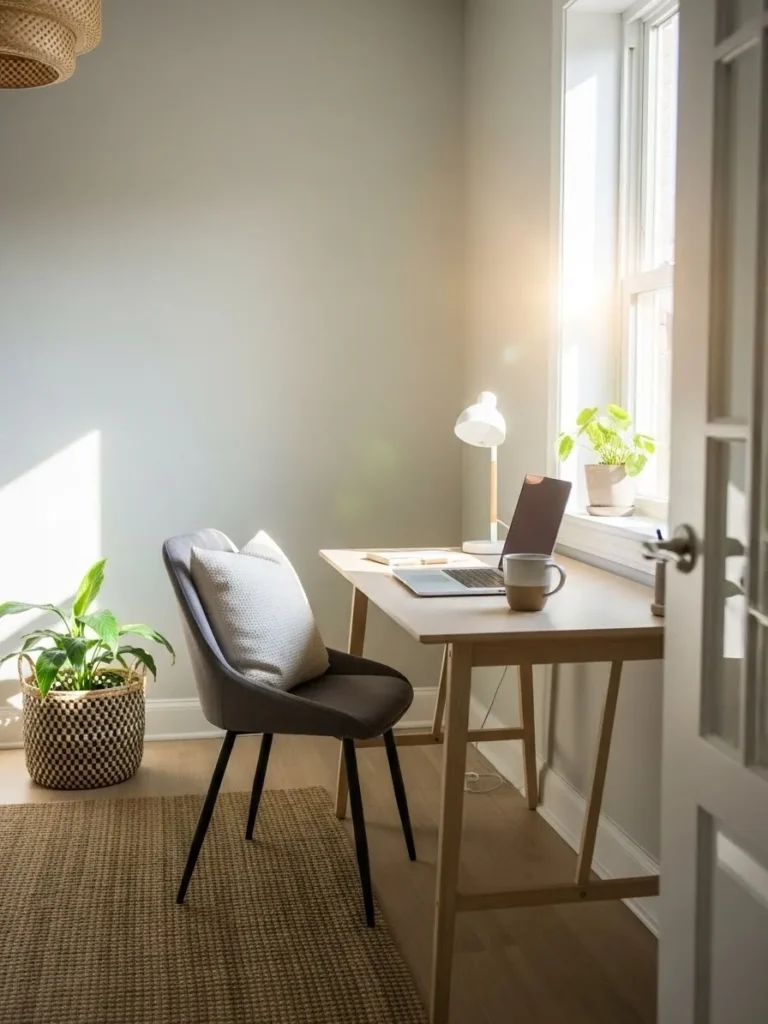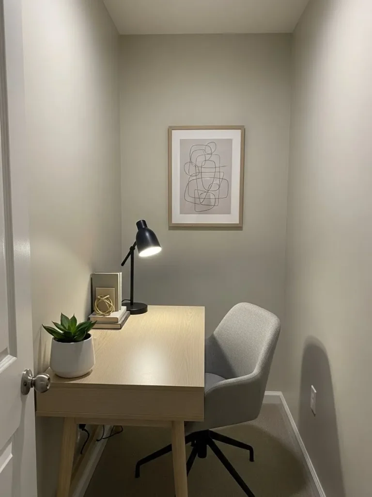 This tiny office nook feels calm and intentional thanks to its soft greige walls that sit perfectly between warm beige and cool gray. The color wraps the space in a cozy, balanced way without making it feel boxed in. A light wood desk keeps things airy while adding warmth, and the simple gray upholstered chair blends in without stealing attention. The black desk lamp adds just enough contrast, and the minimal abstract artwork on the wall gives the space personality without cluttering the vibe. Everything here feels thoughtfully chosen, which is exactly what a small office needs to work hard and still look good.