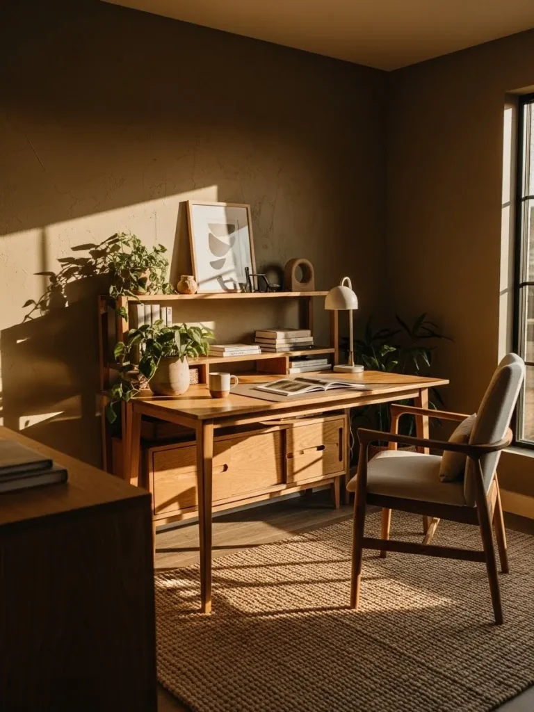 This office design leans into a rich clay brown wall color that instantly makes the space feel grounded and cozy without going dark or heavy. The warm paint has a soft earthy undertone that plays beautifully with the natural wood desk and shelving, almost like they were made for each other. Sunlight pours in and creates gentle shadows that make the wall color shift slightly throughout the day, which adds depth without needing bold accents. The neutral rug, simple desk lamp, and leafy plants keep everything feeling calm, intentional, and very lived in rather than overly styled.