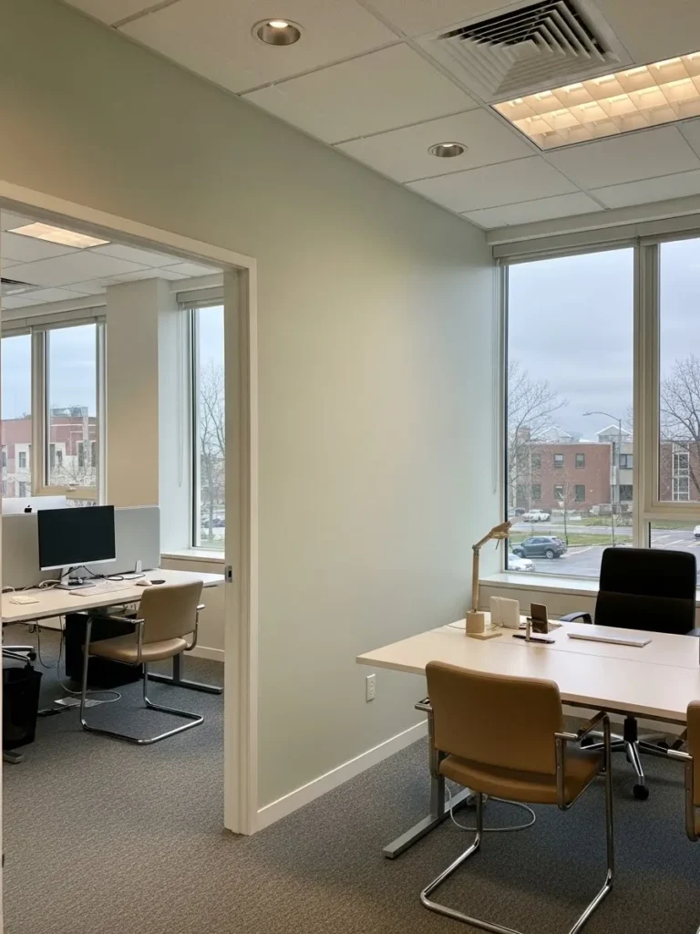This office design leans into a soft eucalyptus green that instantly makes the space feel calm and quietly polished. The walls have that gentle green gray undertone that works beautifully with the clean white trim and large windows flooding the room with natural light. Light wood desks and warm tan chairs add just enough contrast to keep it from feeling flat, while the simple layout keeps everything feeling airy and uncluttered. It is minimal without being cold, and modern without trying too hard, which is honestly such a sweet spot for a work space.