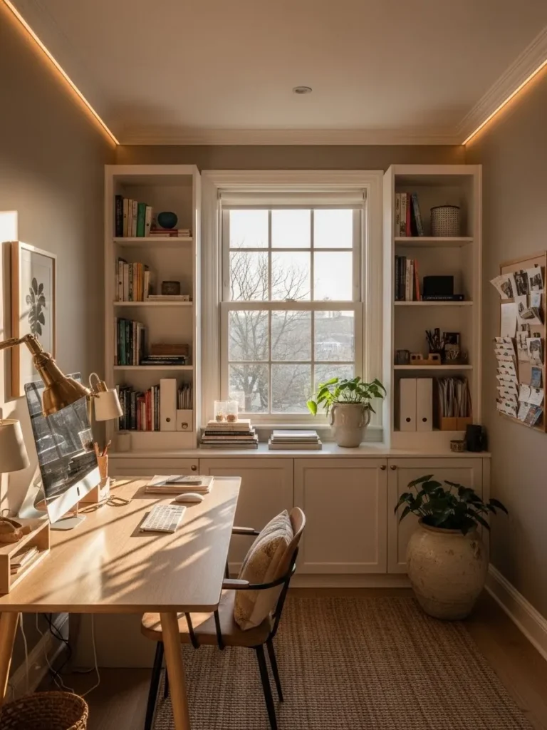 I love this design because it feels like the kind of office you actually want to spend time in. The color is soft but not boring, and it makes the whole room feel cozy yet productive at the same time. I can picture myself sitting here with morning light pouring in, feeling calm instead of stressed before even opening my laptop. It proves that neutral office colors can still feel special and thoughtfully styled without going bold or dramatic.