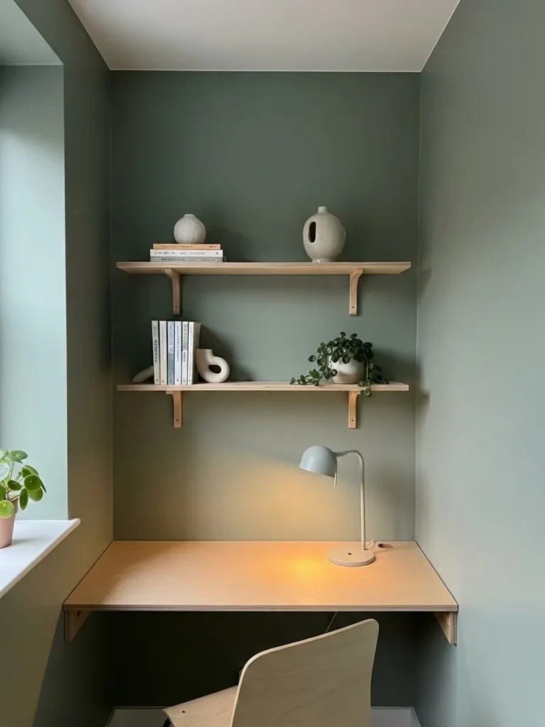 This cozy little office nook feels like a quiet breath of fresh air thanks to that soft moss green paint wrapping the walls. It has a muted earthy vibe that instantly calms the space without feeling dark or heavy. The light wood desk and floating shelves add warmth and keep things looking clean and uncluttered, while the simple ceramics and trailing plant give it just enough personality. I also love how the pale ceiling and soft natural light balance the green so the space feels open instead of boxed in, even though it is a compact setup.