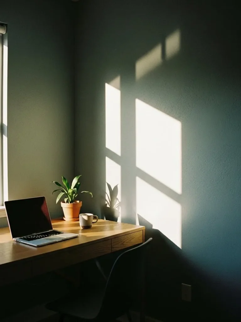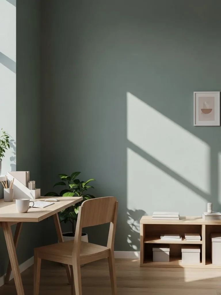 This office space leans into a rich blue green wall color that feels calm without going flat or boring. The paint has a soft depth to it that shifts beautifully as sunlight moves across the room, especially with those crisp window shadows dancing on the wall. Paired with a simple wood desk, a sleek chair, and a small potted plant, the whole setup feels intentional but not fussy. It is minimal in the best way, letting the color do the heavy lifting while the natural materials keep everything grounded and cozy.