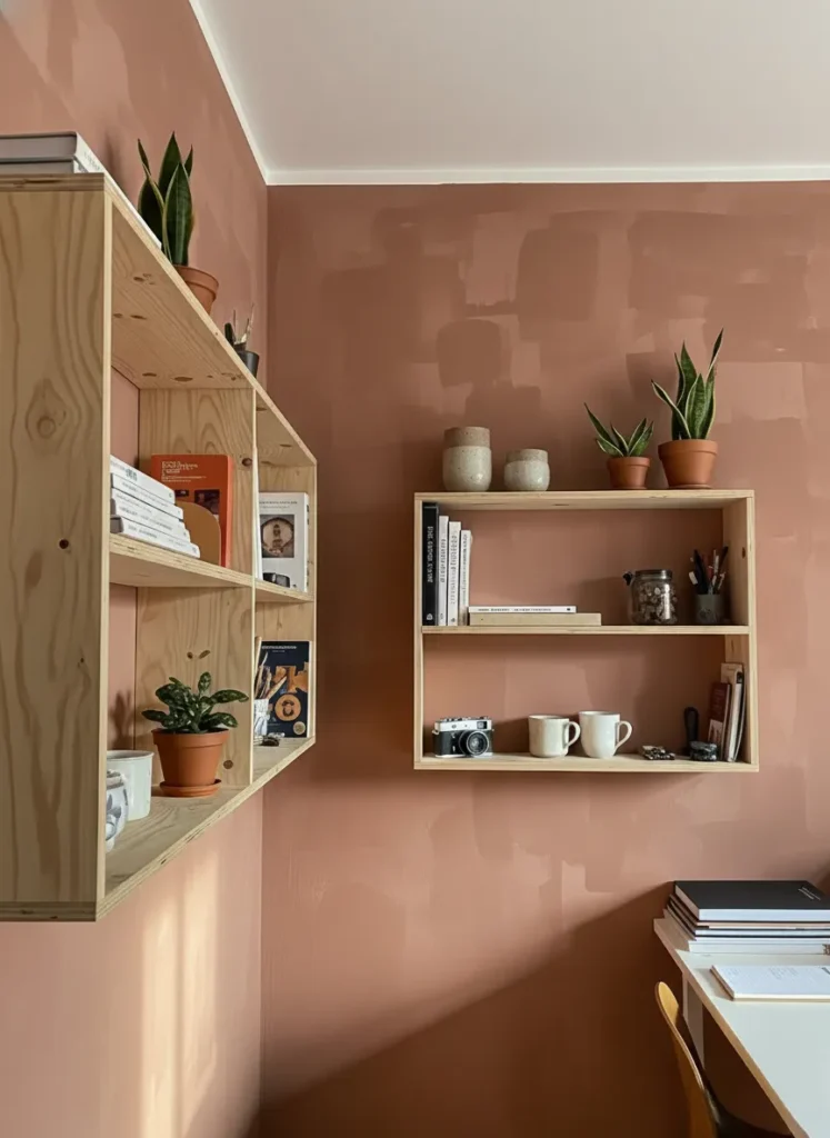 Warm Clay Office With Natural Wood Shelving