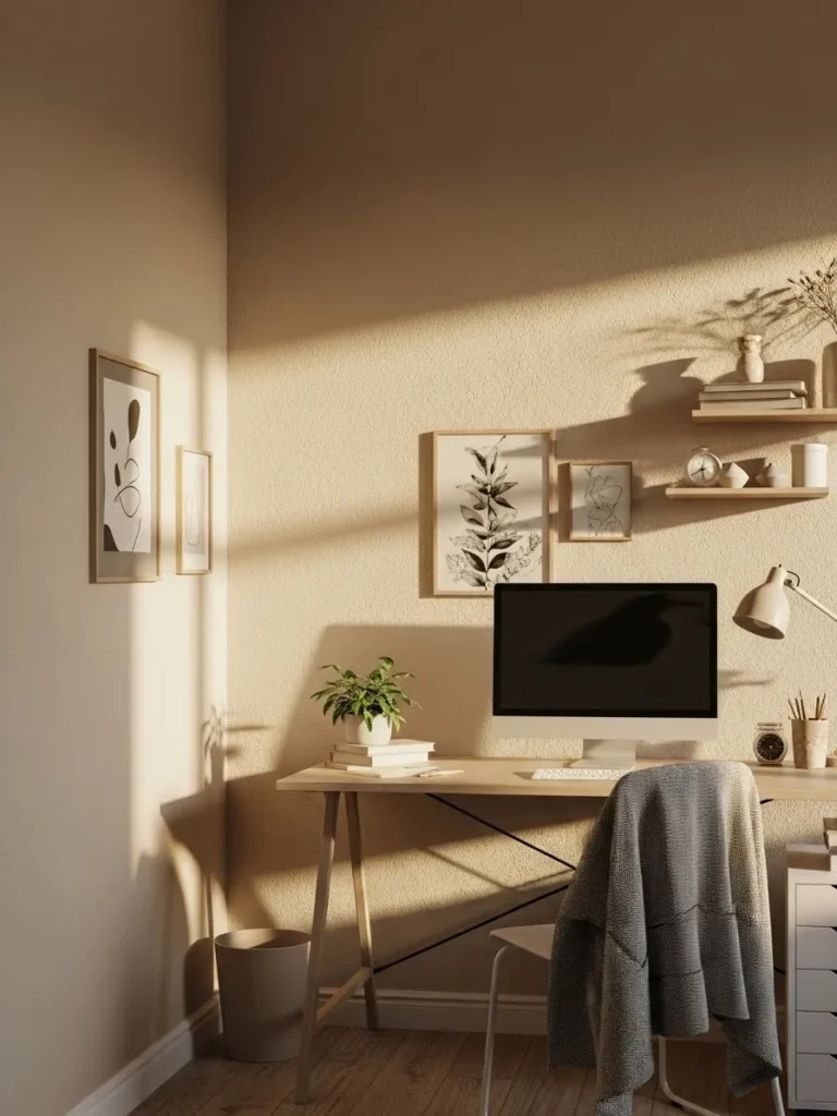 This office design feels soft and calming with its warm oatmeal toned walls that glow beautifully in the sunlight. The color sits somewhere between beige and light tan which gives the space a cozy but still modern feel. Light wood furniture keeps everything airy while simple framed art and floating shelves add personality without clutter. I love how the neutral palette lets textures shine from the woven chair fabric to the subtle wall finish and even the leafy plant on the desk.