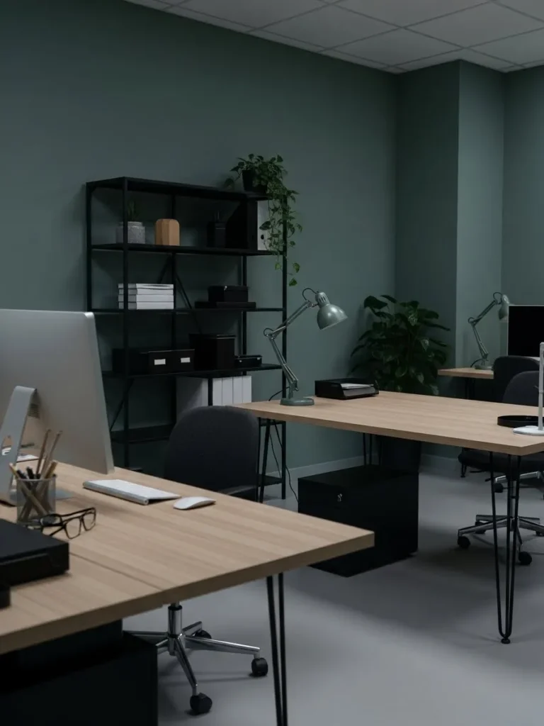 This office design leans into a muted teal wall color that feels calm without being boring and modern without trying too hard. The paint has a soft gray undertone that keeps it grounded, which pairs beautifully with the light wood desks and matte black furniture. Clean lines, simple shelving, and a few leafy plants make the space feel intentional but not overly styled. Everything about this room feels balanced, from the neutral flooring to the warm desk surfaces that soften the cooler wall color.