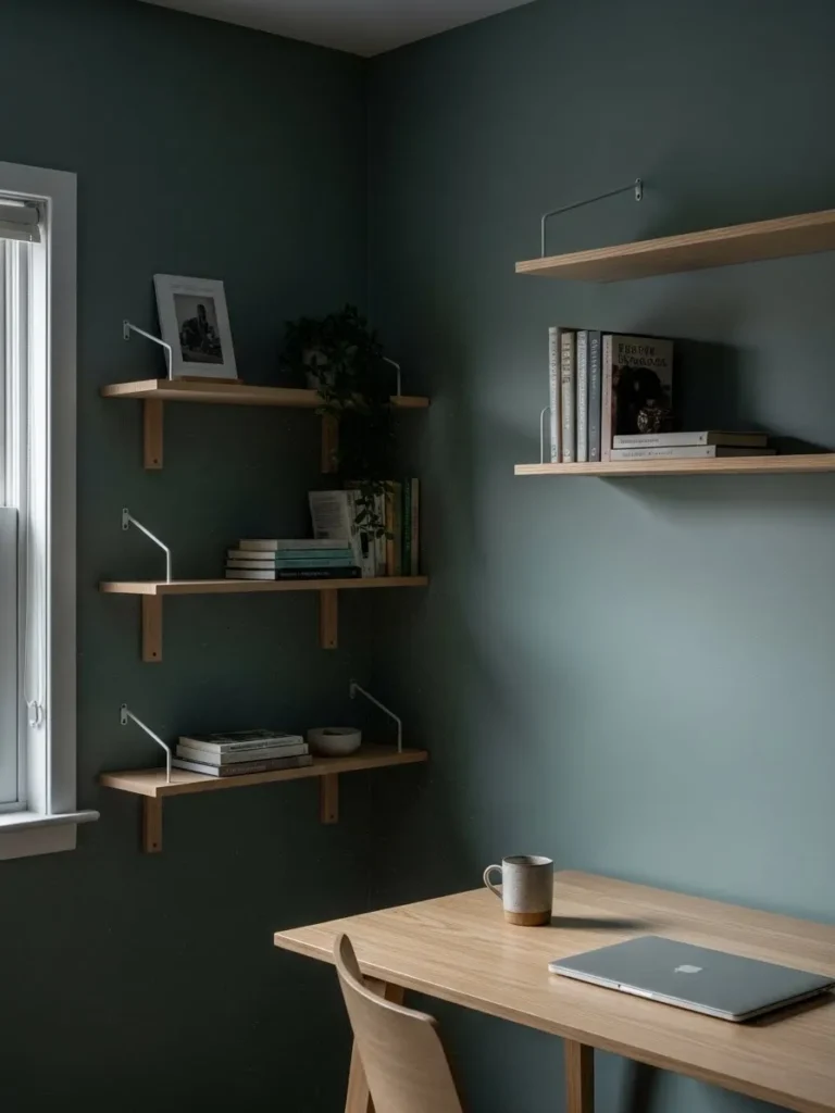This office space leans into a muted stormy blue green tone that feels calm without going sleepy. The walls wrap the room in a cozy matte finish that softens the light coming in from the window. Light wood shelves and a matching desk add warmth and keep things feeling airy instead of heavy. The styling is simple but thoughtful with a few books, a trailing plant, and clean lines that make the whole setup feel intentional but not fussy. It is the kind of office that feels quietly pulled together and very easy to live with.