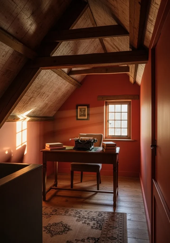 Rustic Terracotta Attic Office With Dramatic Wood Beams