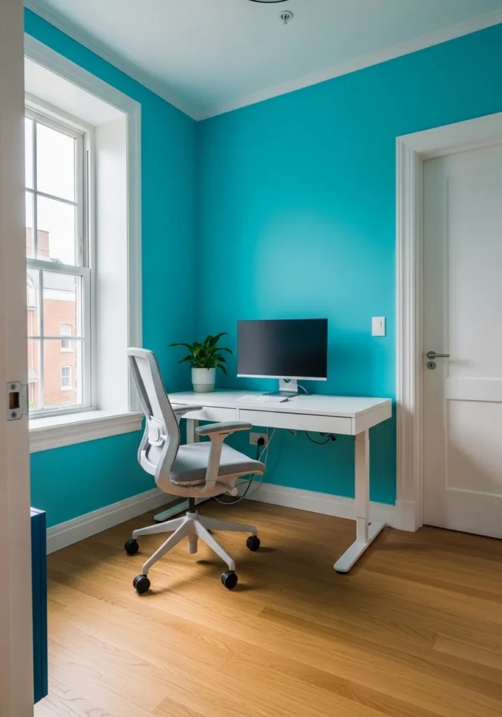 This compact office makes a bold impression with its crisp teal blue walls. The vibrant tone instantly draws the eye and pairs beautifully with the simple white desk and light wood chair. Sunlight streaming through the window creates bright highlights across the wall, showing off the richness of the color. The clean layout keeps the space functional while the paint adds personality.
